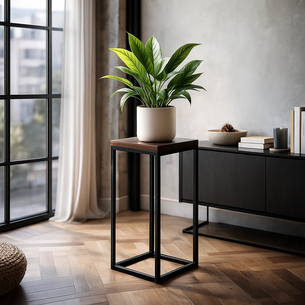 Stojak na kwiaty z metalową konstrukcją i laminowanym blatem łączy minimalistyczną formę z eleganckim wykończeniem. Stabilna podstawa i proporcje sprawiają, że roślina staje się naturalnym elementem aranżacji, a całość wygląda lekko i nowocześnie.